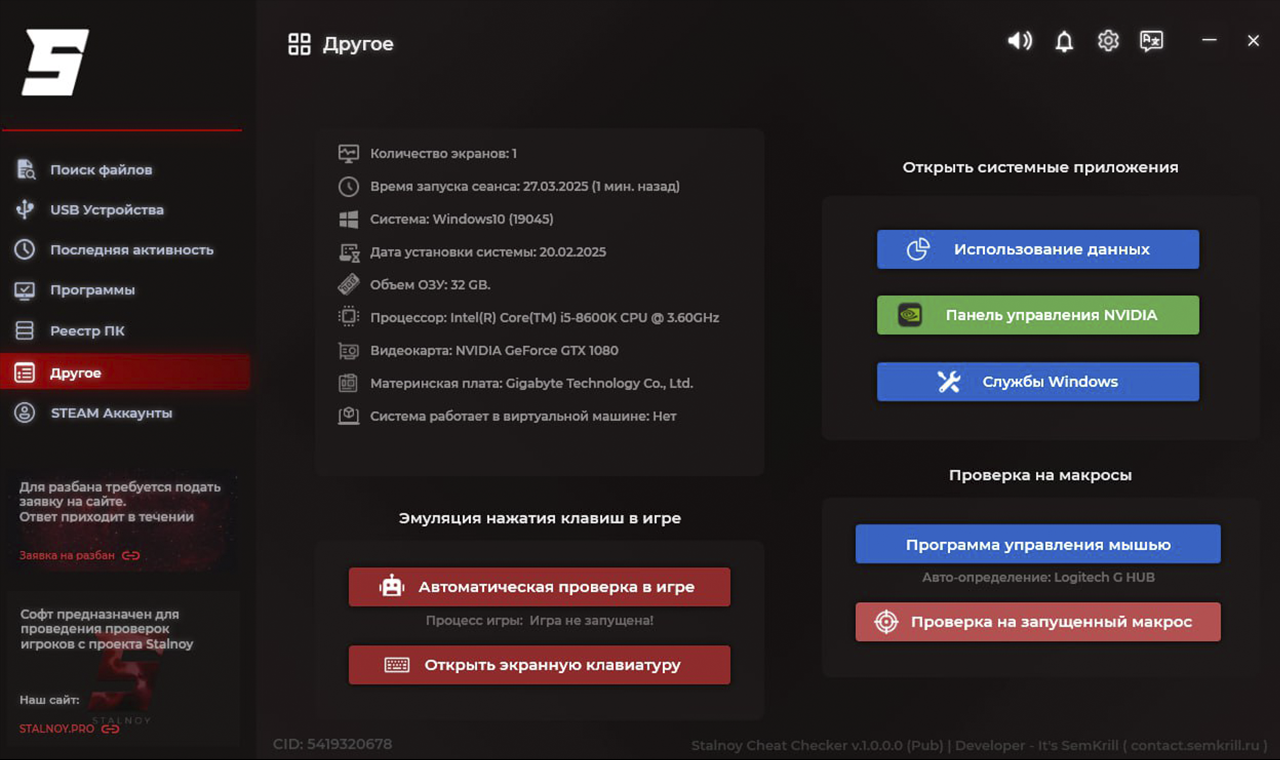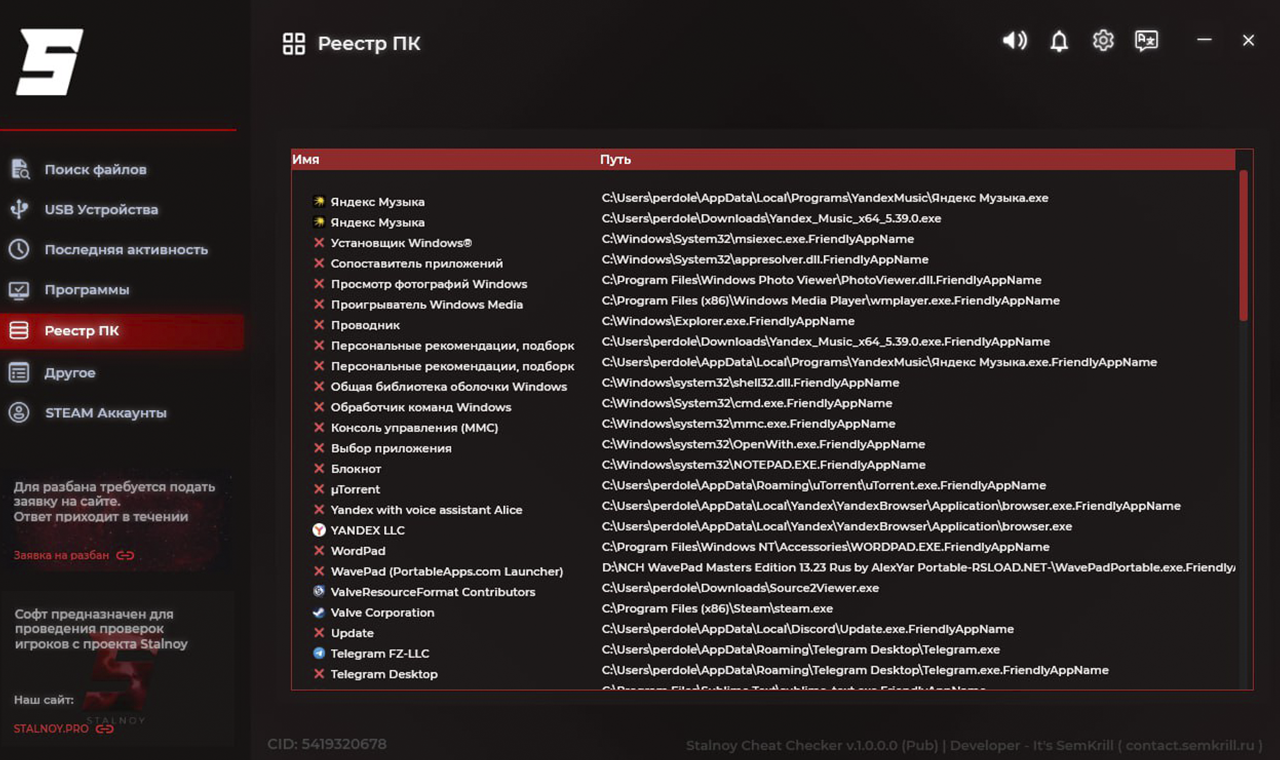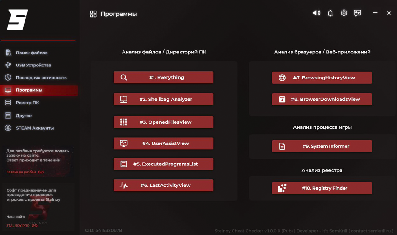 • Программа предназначена для обеспечения удобства при проверке Администратором Игрока на наличие стороннего ПО.